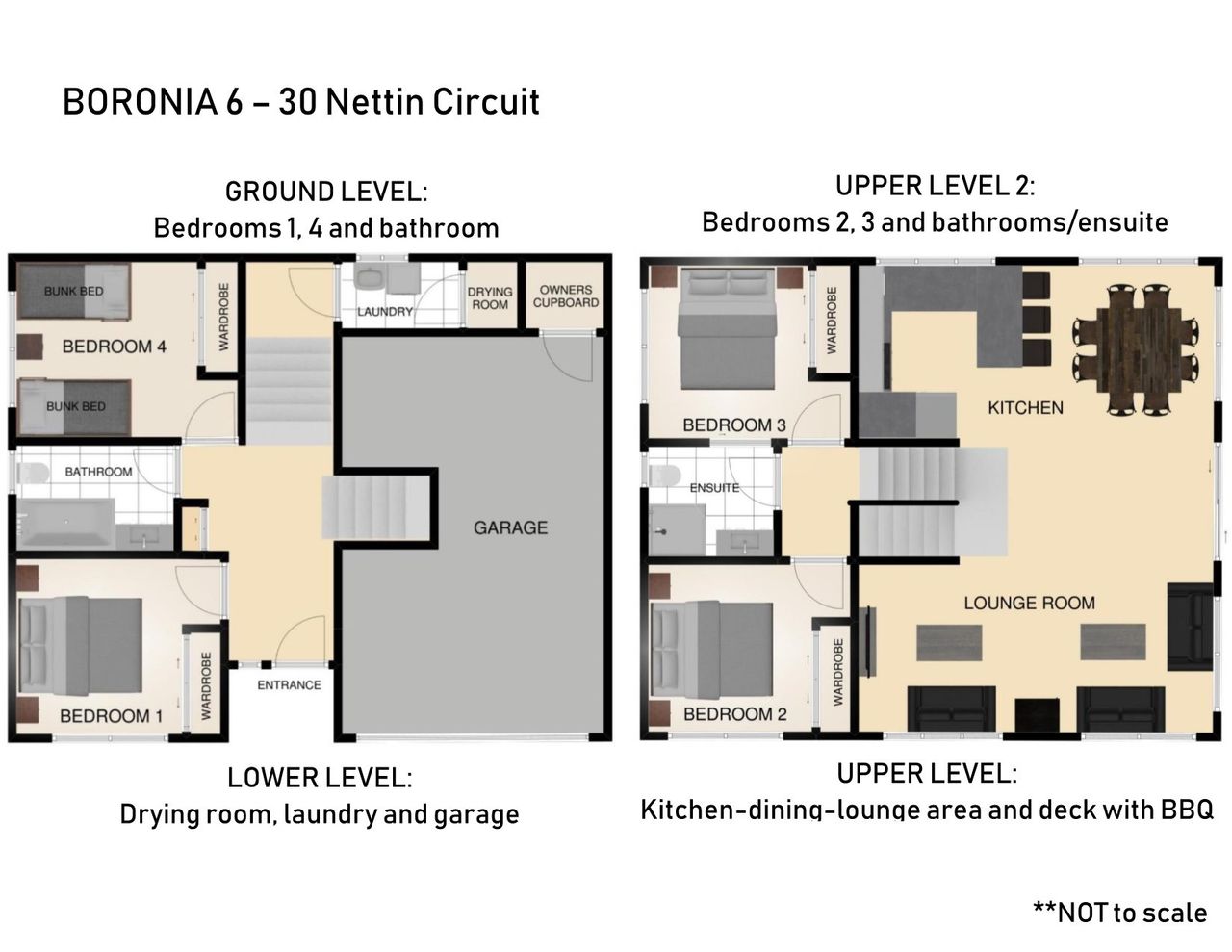 Boronia 6 is a freestanding split level townhouse located in Nettin Circuit for ease of access to main roads in the Snowy Mountains. Four bedrooms offer three queen bedrooms (one queen can be split into two singles on request at time of booking), one with two bunks and all with electric heating.