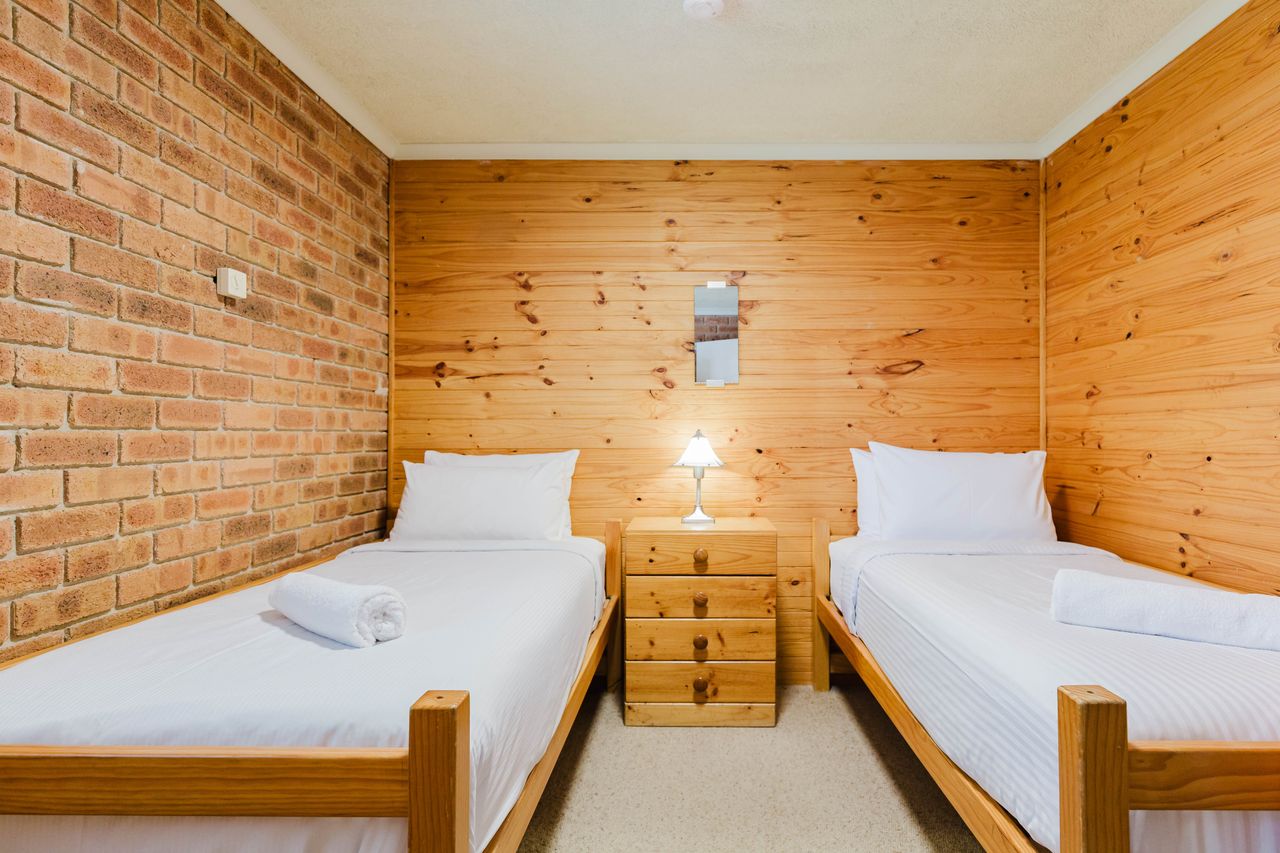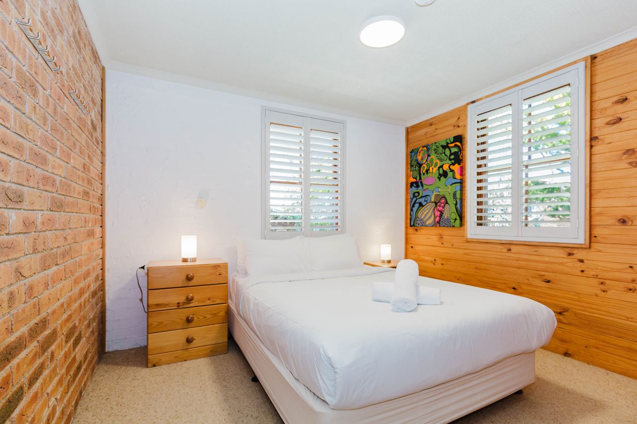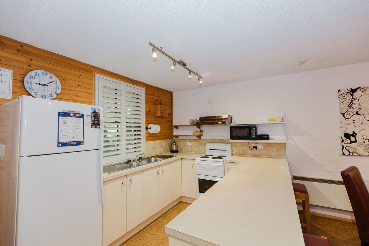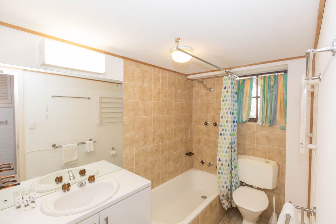 Located on a split level up just a couple of steps is the two bedrooms, one with a double bed and the other has two singles. The loungeroom is a great size for four guests which leads to a balcony. Apartment is located back off the main road and has two off street car spaces.