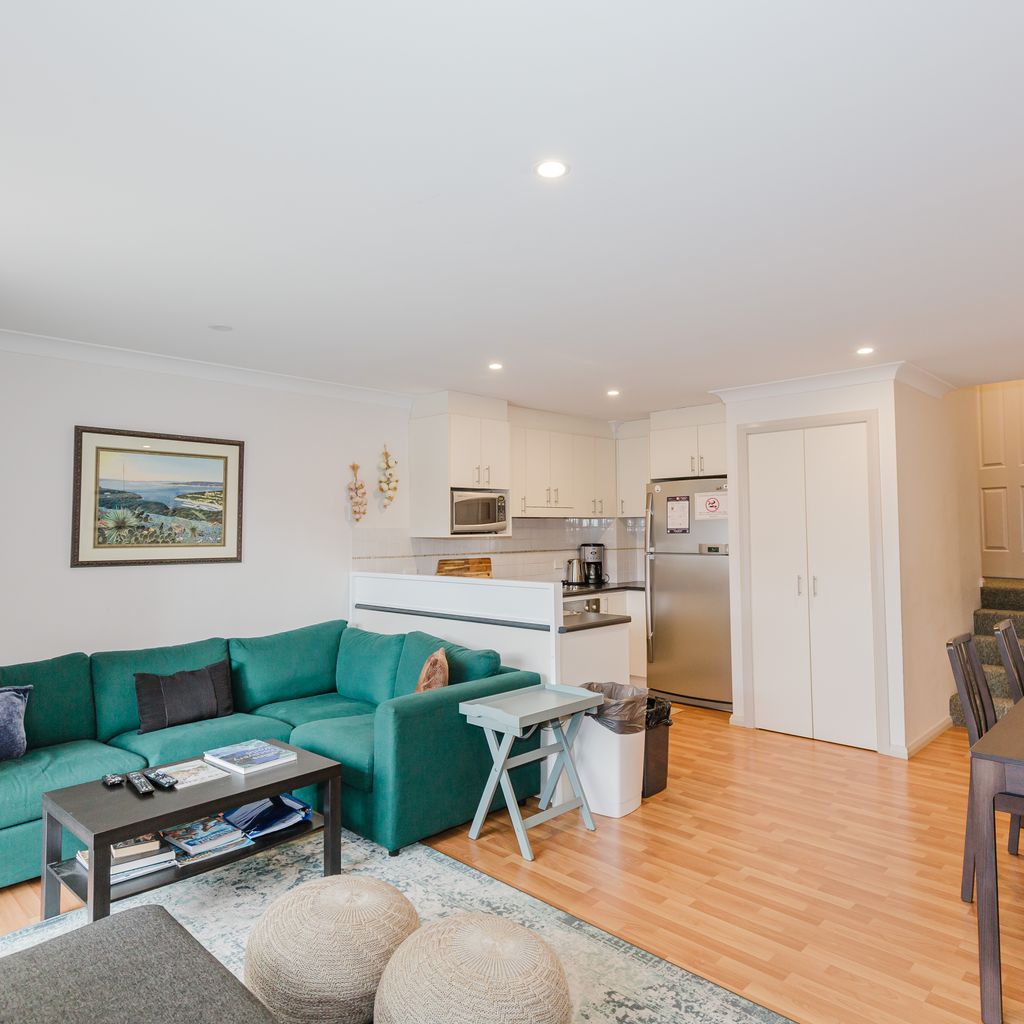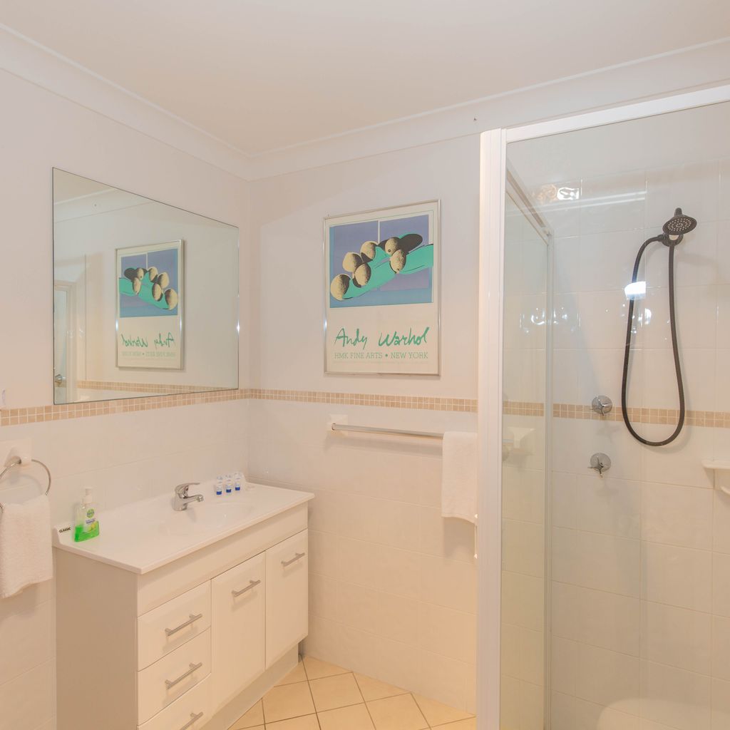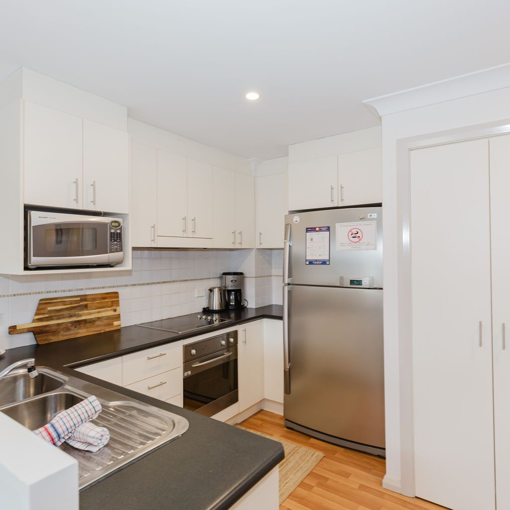 The master bedroom on the top level has a queen bed, private ensuite, own balcony and large walk in robe. The second bedroom has a set of bunks which is on the same level as the main bathroom. Downstairs you will find the third bedroom with queen bed, situated off the garage which has been tiled and doubles as a rumpus room if you wish. Here you will also find a full laundry with third toilet for convenience. There is one outdoor car space assigned as well as one space in the garage.