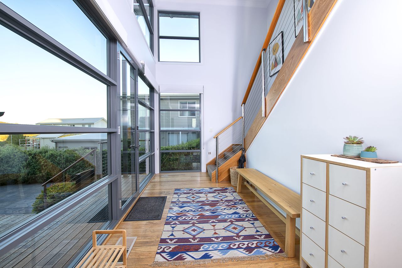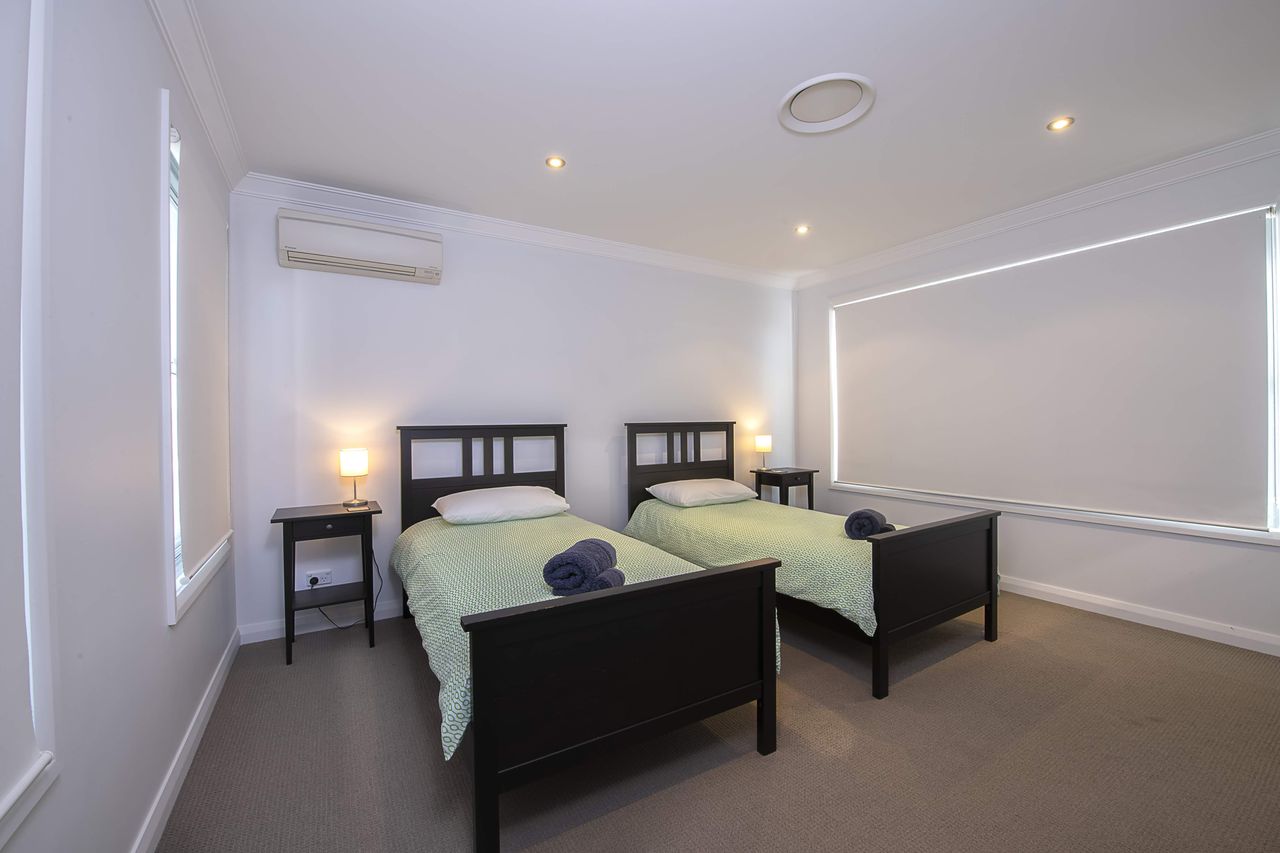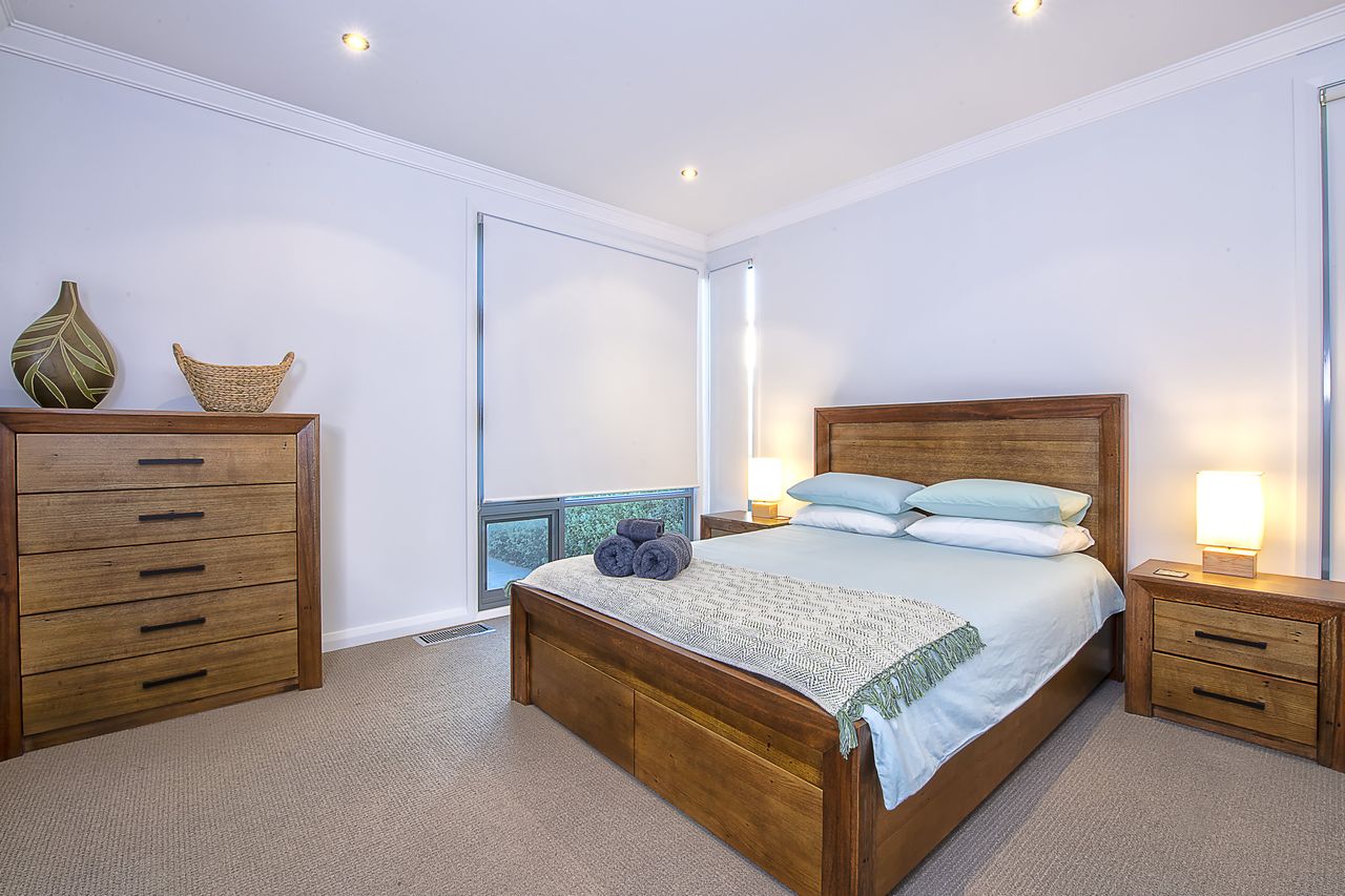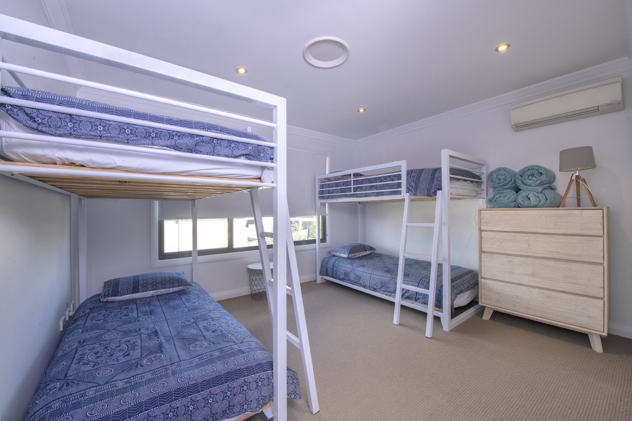 Upstairs, you’ll find bedroom two with a queen bed, bedroom three with two king single beds and bedroom four with two sets of single bunks.